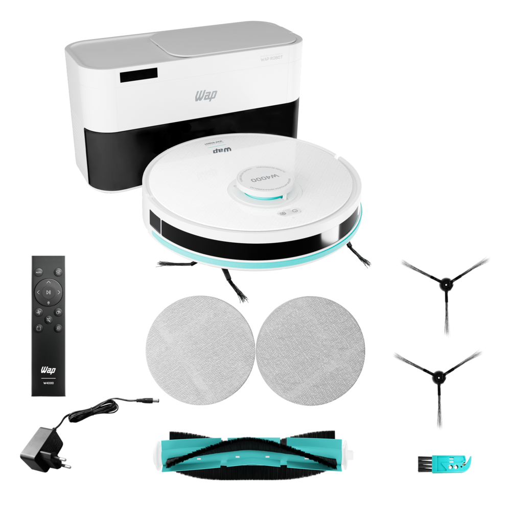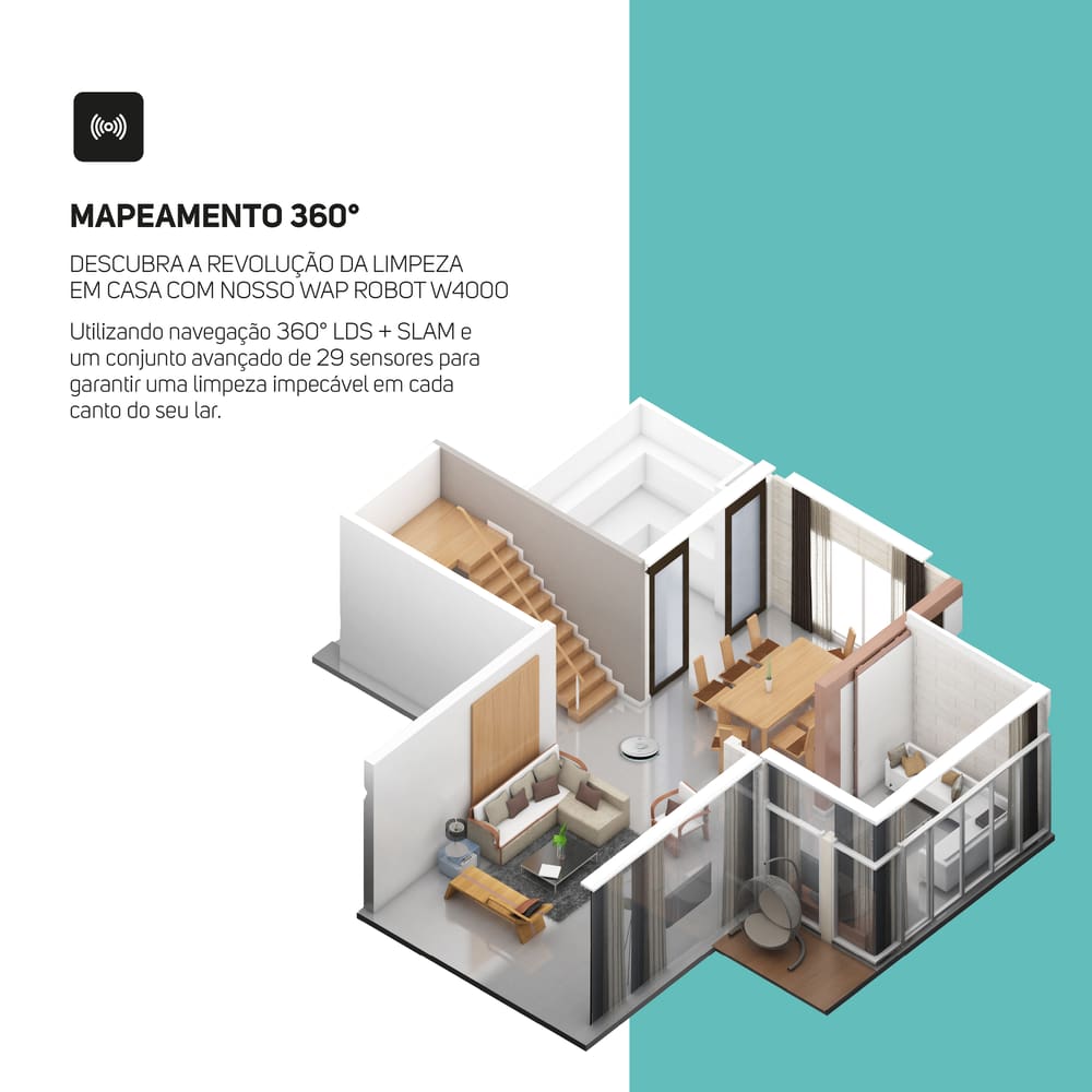 Controle tudo pelo smartphone via app WAP CONNECT ou pelo controle remoto. A navegação a laser (LDS) e a tecnologia SLAM permitem mapeamento em tempo real com varredura 360°, criando mapas precisos em 2D e 3D. O robô memoriza até cinco andares e permite personalizar a limpeza por cômodo, zonas e paredes virtuais.