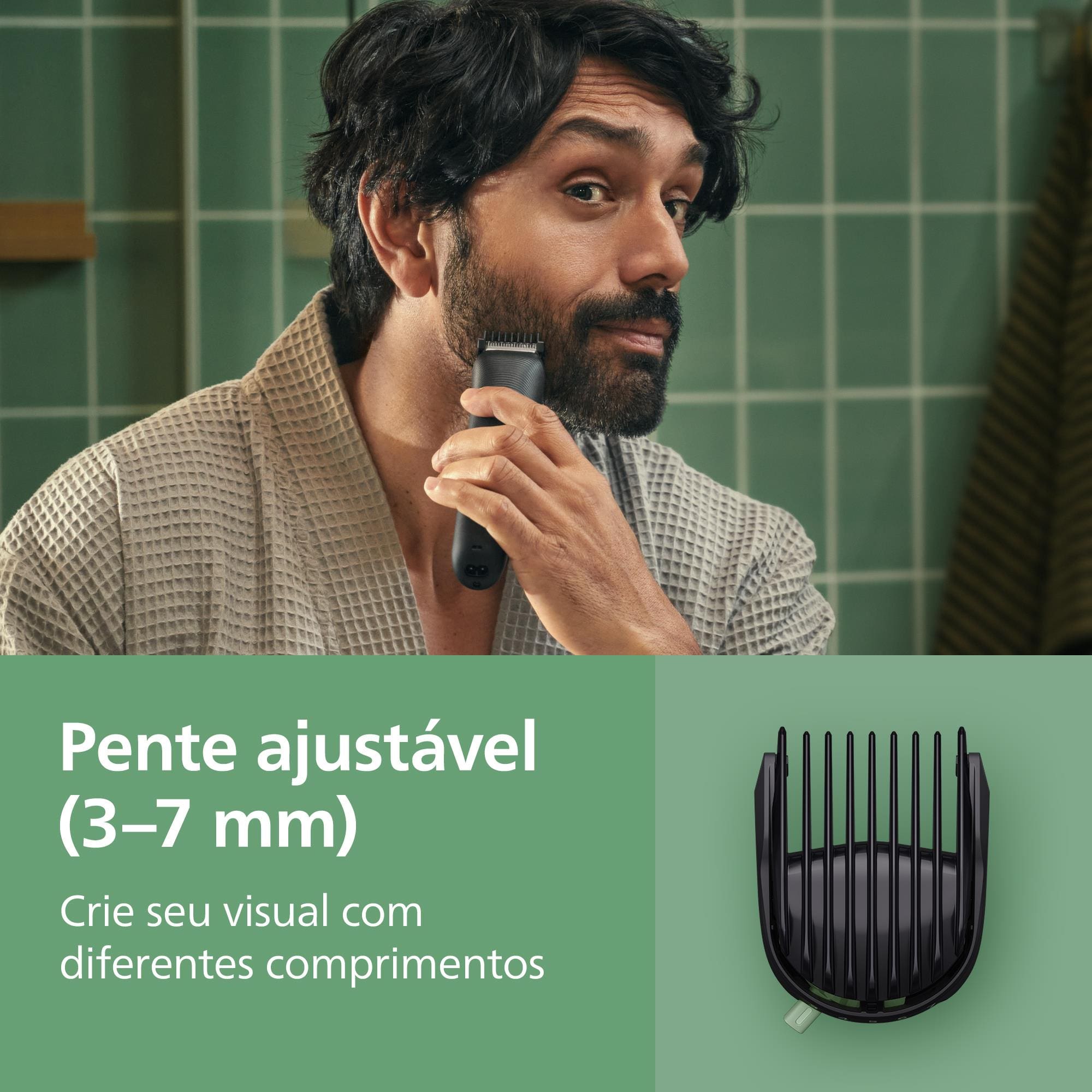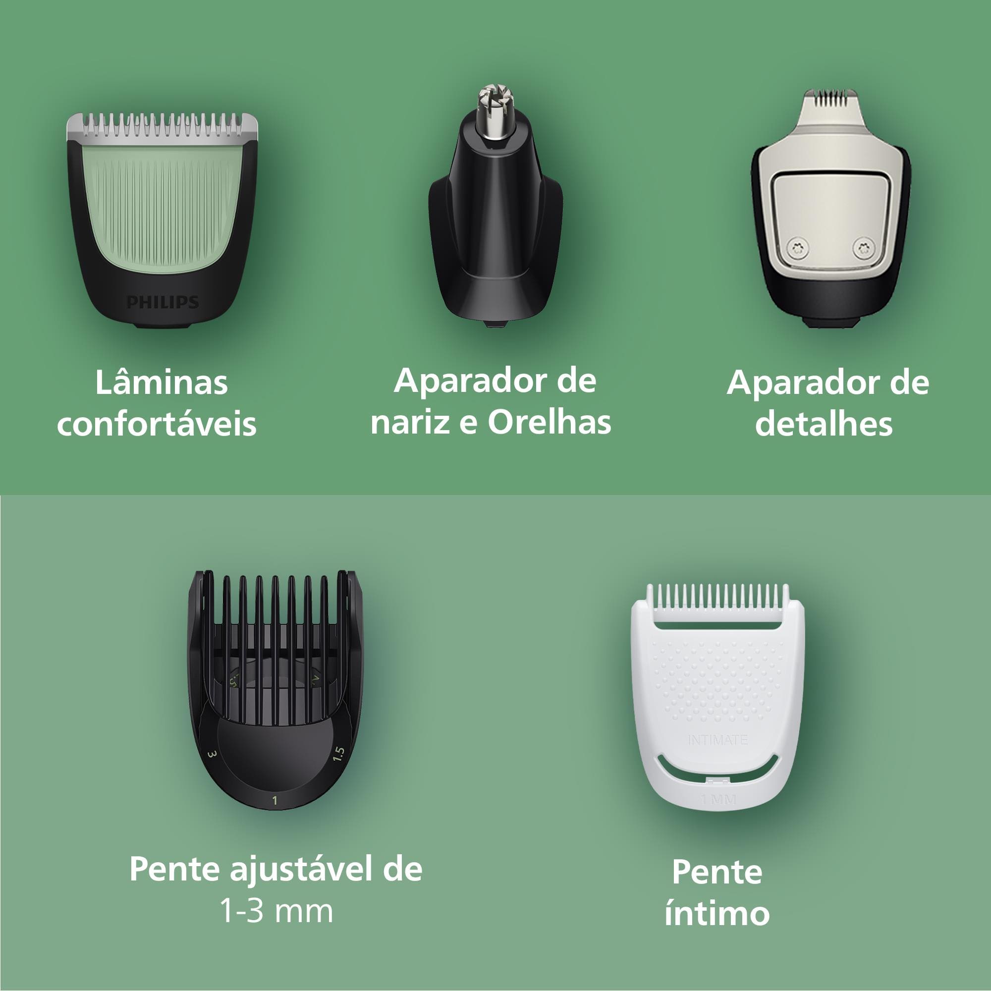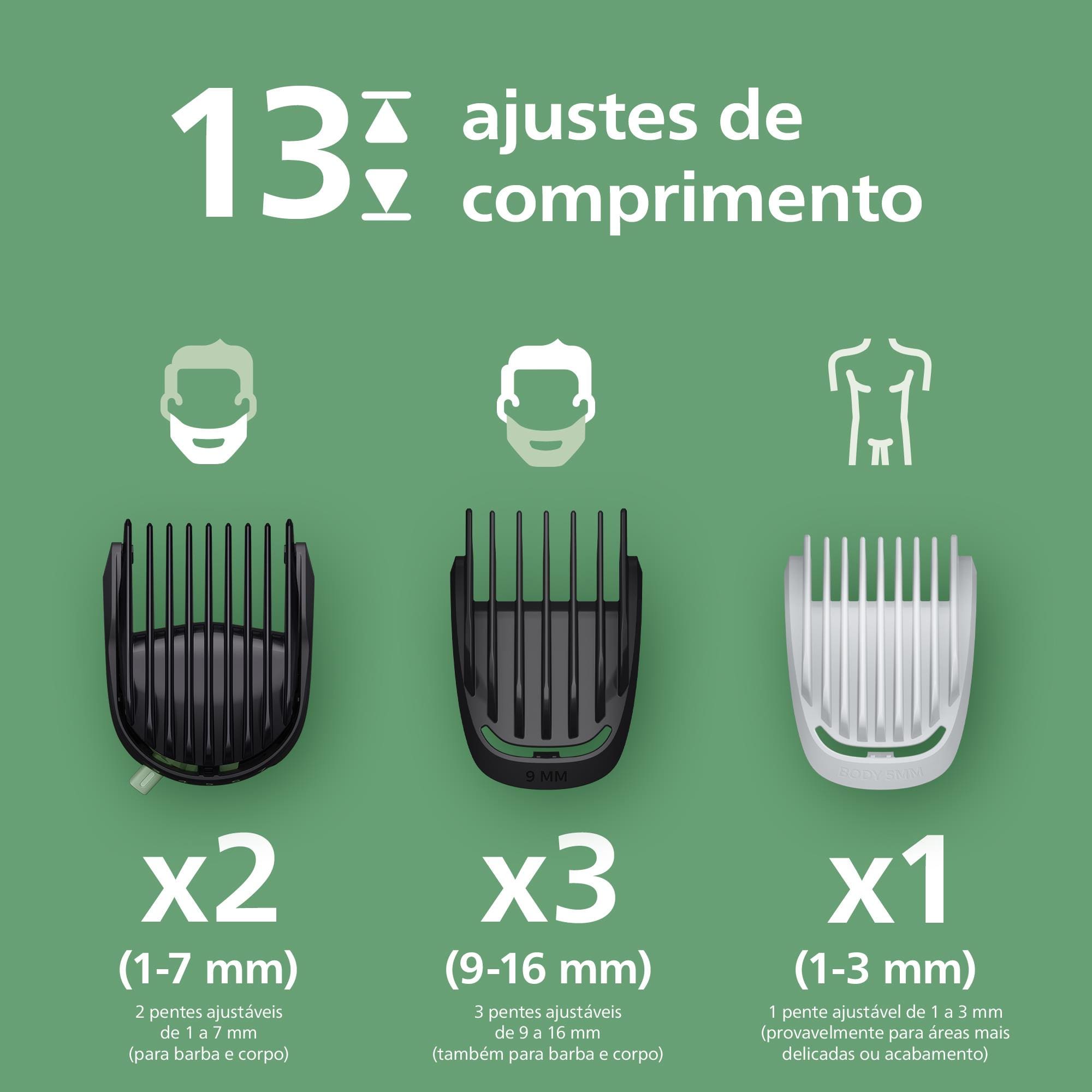 Este modelo da Série 3000 inclui 10 acessórios para aparar pelos do rosto, corpo e cabelo, além de áreas íntimas, nariz e orelhas. Os pentes ajustáveis oferecem precisão de corte entre 0,5 mm e 16 mm, garantindo resultados personalizados.