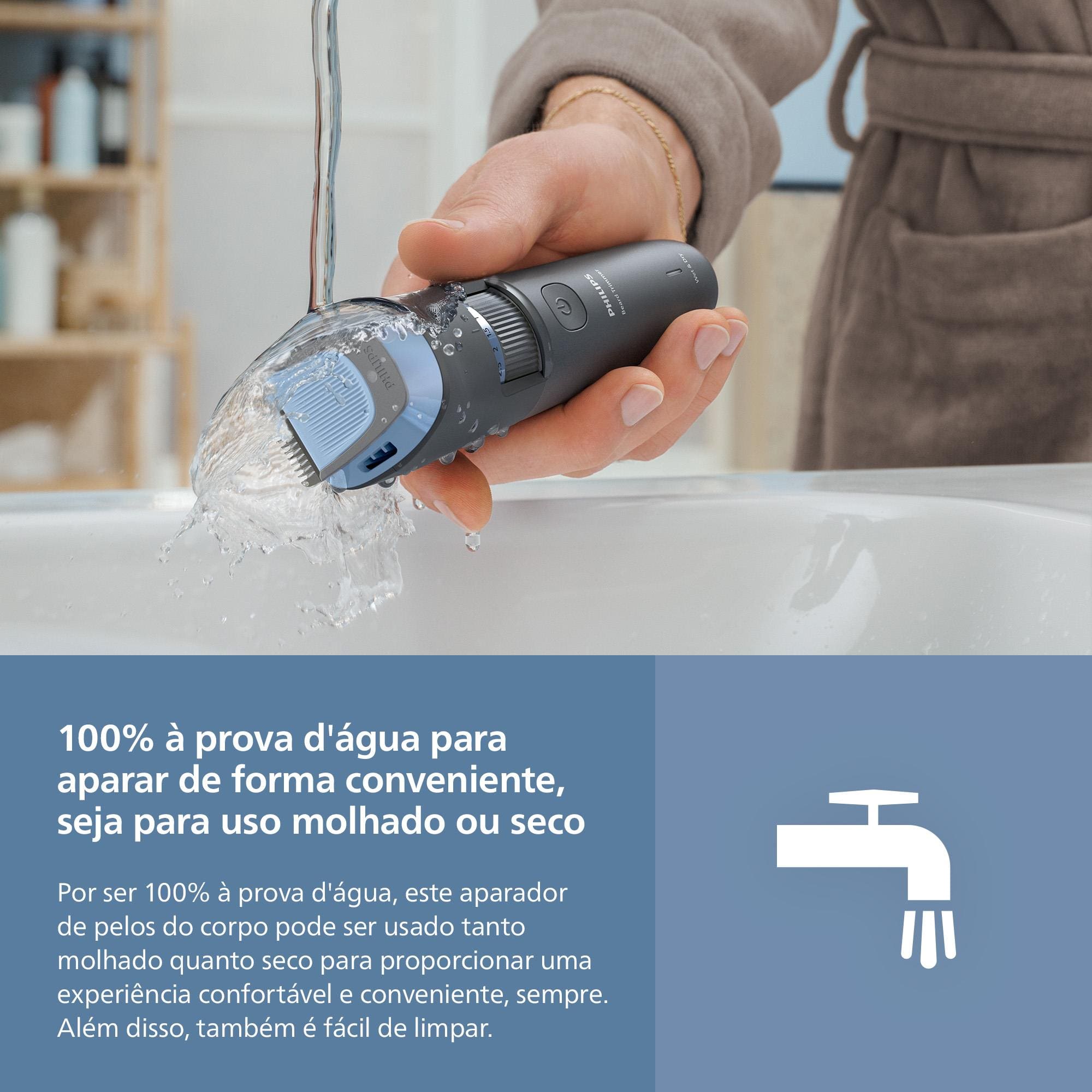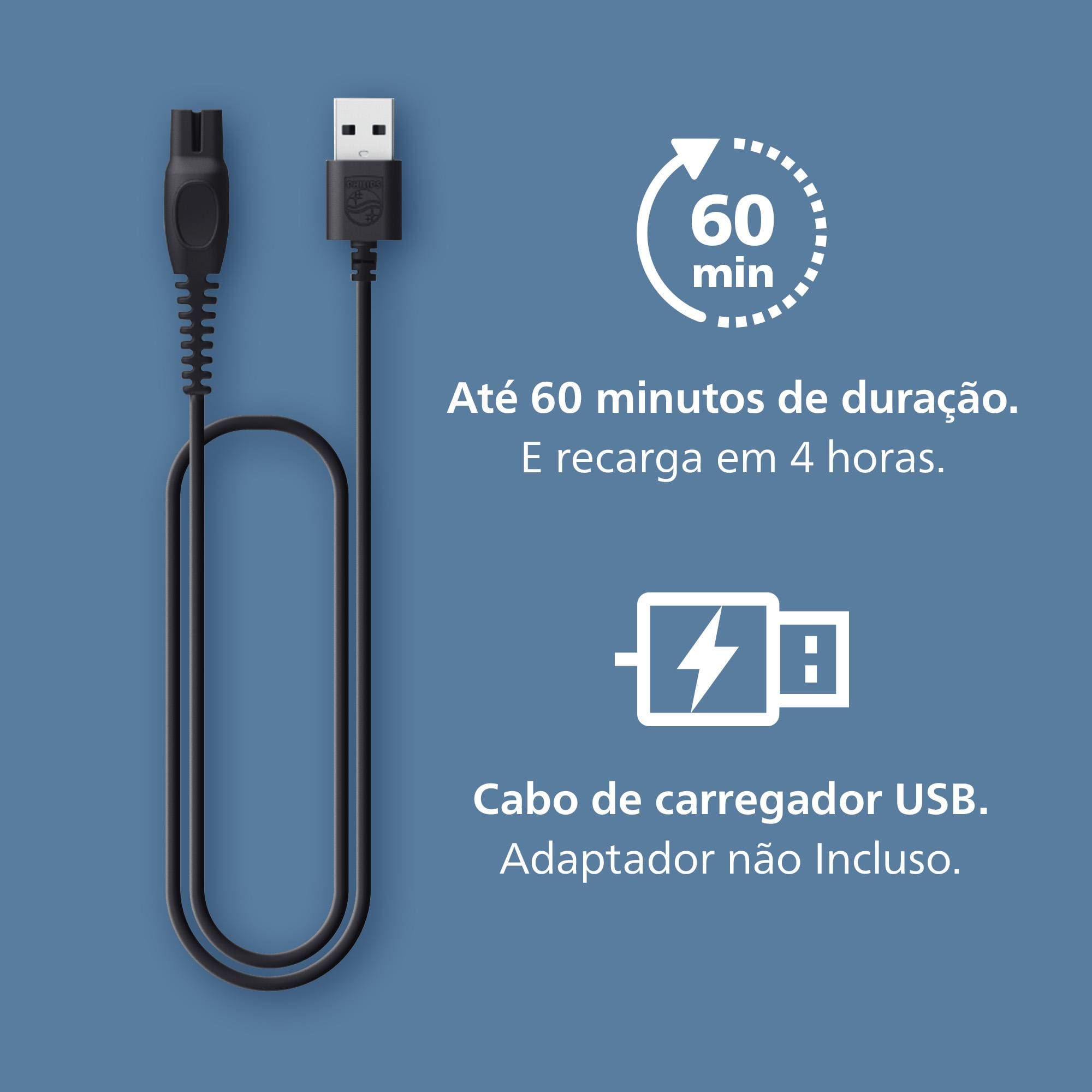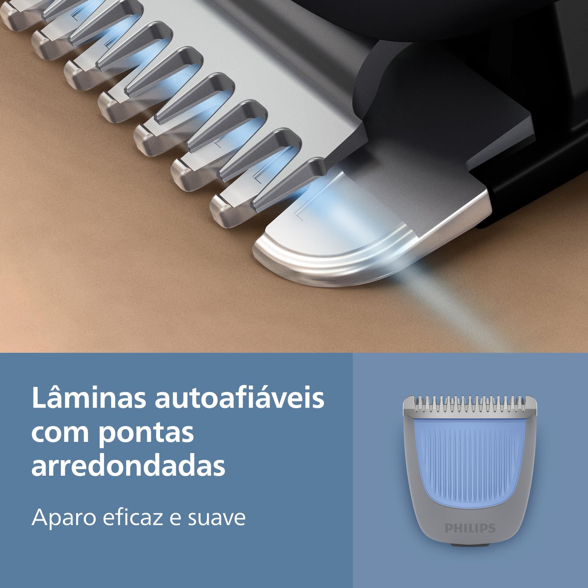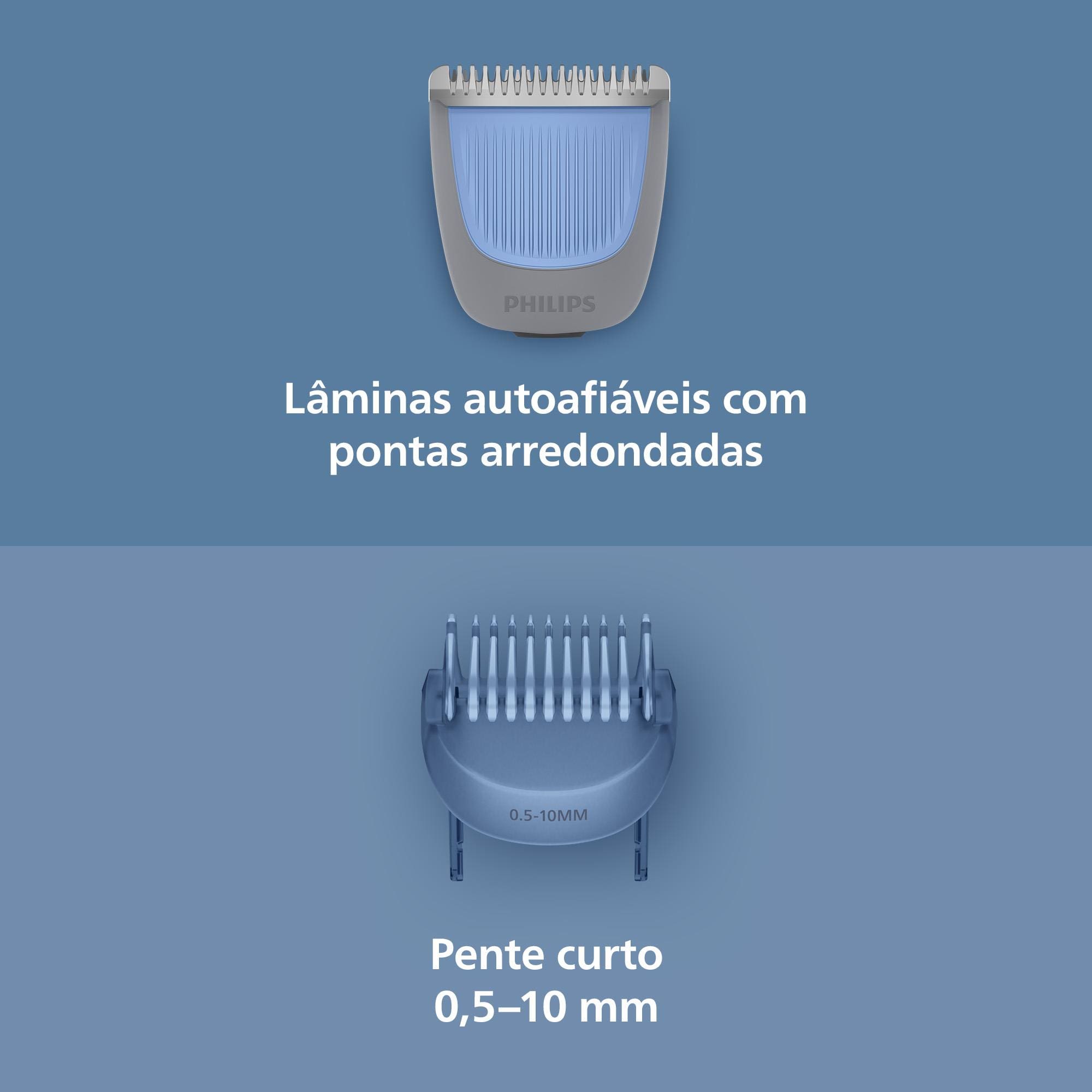 Acompanha pente ajustável, escova de limpeza e cabo USB-A (adaptador não incluso). A Philips oferece 5 anos de garantia e 90 dias para testar, reforçando a confiança na qualidade do produto.