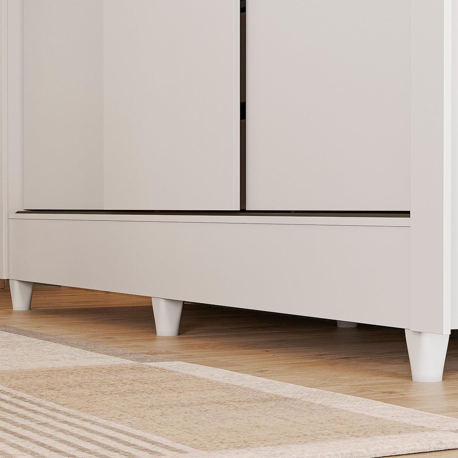 Fabricado em MDP 12 mm com acabamento em verniz brilhante e proteção UV, o roupeiro garante durabilidade e fácil limpeza. As portas deslizam suavemente sobre trilhos em ABS, otimizando o espaço do ambiente.