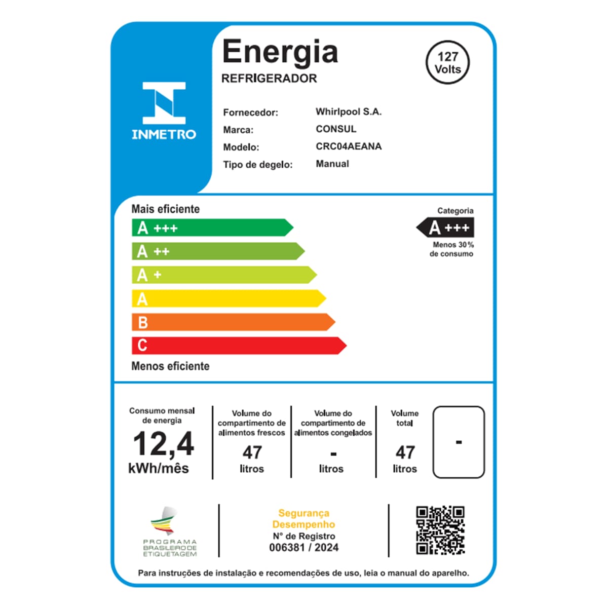 Além de compacto, o frigobar Consul CRC04AE é altamente econômico: o modelo 127V economiza até 30% de energia e o 220V até 20%, comparado à classificação A do Inmetro. Isso significa mais eficiência e menos impacto na sua conta de luz.